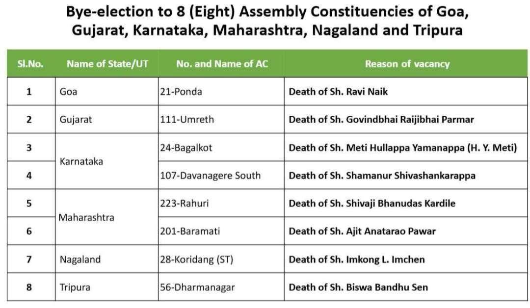 The bye-election to eight constituencies was also declared for the state of Goa, Gujarat, Karnataka, Maharashtra, Nagaland and Tripura.