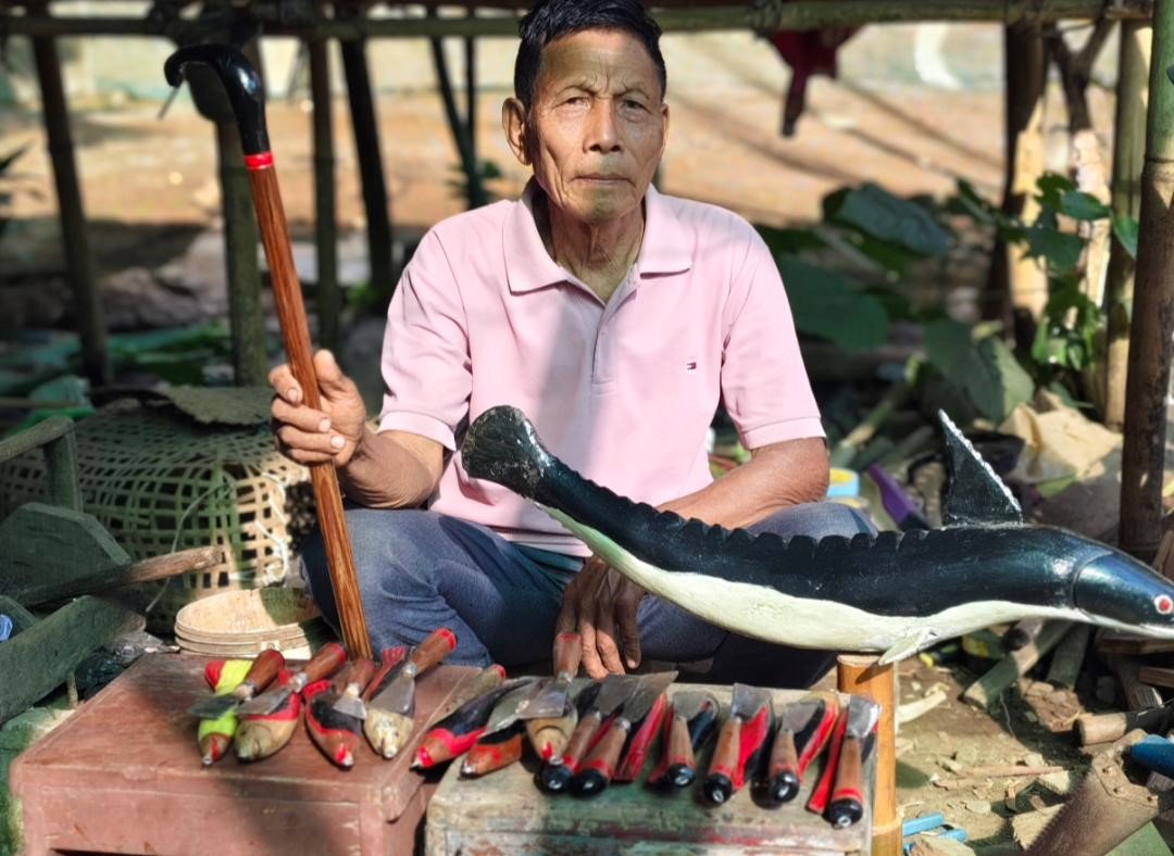 The items he makes include wooden knives, daos, walking sticks, plates, bowls, Naga plates, and handcrafted wooden hornbill models, dolphins, and other animals made from Gamari trees commonly found in Tuli. He says he buys Gamari trees in whole, big or small with prices ranging from hundreds to thousands.