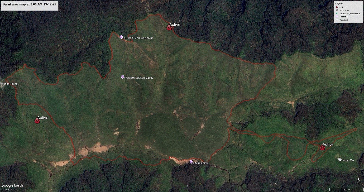 The major wildfire that broke out in the Khonoma Dzükou area on Friday morning is said to have engulfed approximately 1.8 square kilometres of forest and wildlife habitat on the same day and continue to spread gradually.