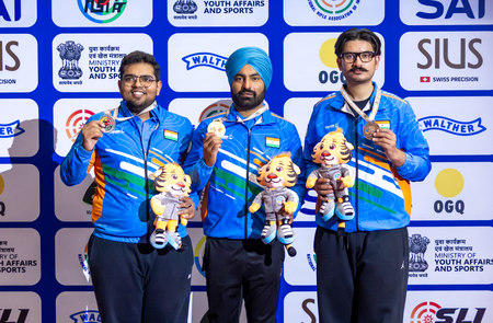 The Rio 2016 Olympian Gurpreet Singh won gold in the 25m Standard Pistol event, leading to a clean sweep of the podium. Harsh Gupta secured silver while Amanpreet Singh won the bronze medal. In the junior category, the Indian shooters repeated the clean sweep with Suraj Sharma, Mukesh Nelavalli, and Tanishq Muralidhar Naidu winning gold, silver, and bronze medals, respectively. Both seniors and juniors also won the team gold in their respective categories.