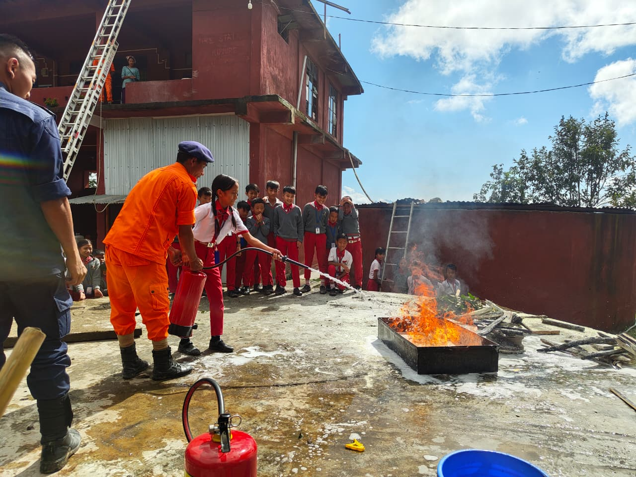 A key highlight of the visit was the live demonstration and lecture conducted by ASI Meyielemba Jamir and ASI Khariba T Sangtam. They demonstrated key firefighting techniques, such as spraying water from hosepipes and using different types of fire extinguishers.