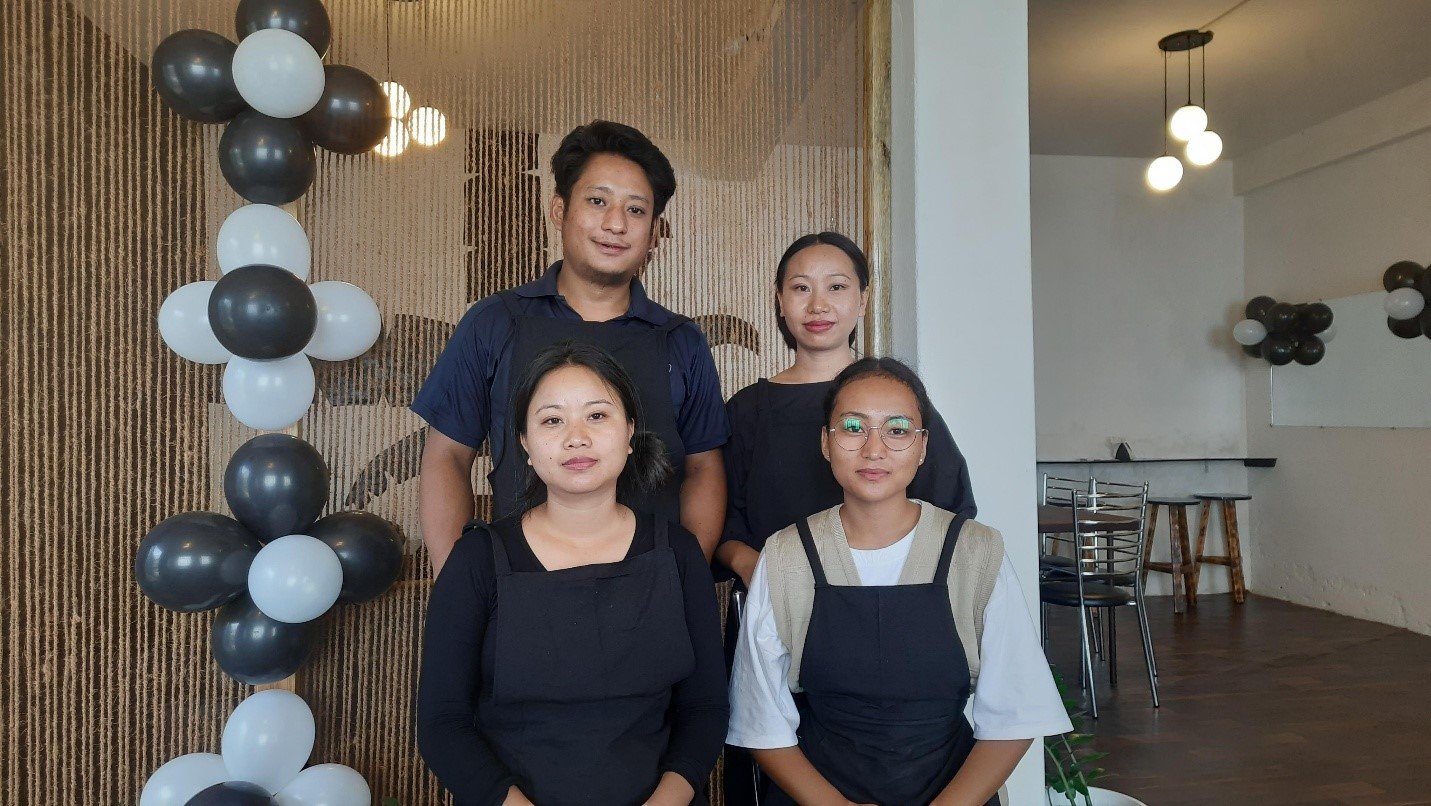 BY NTN / Wednesday, 25 October, 2023Kohima: Shekhonu Rhakho and Samanier Jamir (standing) along with staffs of Food Fusion at the newly opened restaurant in Kohima.