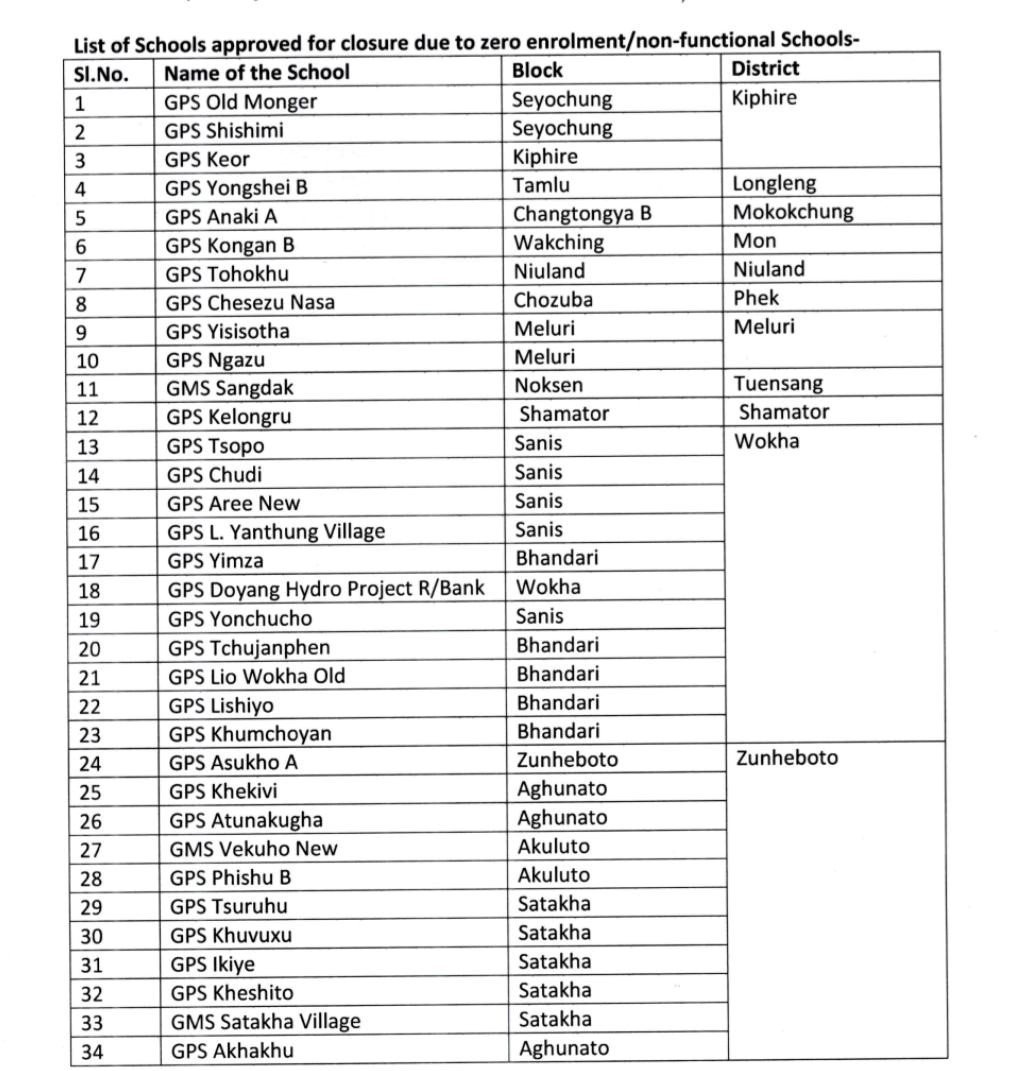 The Department of School Education (DSE), Government of Nagaland has issued a notification for the closure of 34 Government Primary Schools (GPS) and Government Middle Schools (GMS) citing zero enrolment and non functioning.
