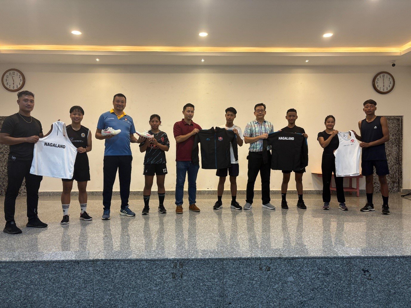 On September 16, members of the Nagaland Athletics Association (NAA) visited the athletes during their training. NAA honorary secretary Mhonsao Ngullie, senior joint secretary Purna Konyak, and technical convenor Bithungo Kikon interacted with the athletes and coaches. A prayer was held, and the athletes were presented with jerseys and sports shoes.