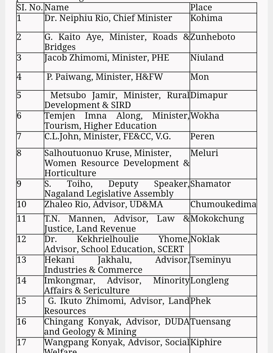 The Government of Nagaland Home Department has notified the Chief Minister and the following Ministers/Advisors and the Deputy Speaker who will unfurl the National Flag and take Rashtriya Salute on the occasion of Republic Day on January, 26 at the places shown against their names: