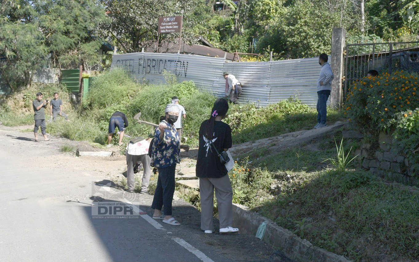 All the 11 wards, business establishments and the general public of Mon Town participated in the mass social work by engaging with cleaning and clearing of the drains, removal of sludge, cutting of overgrowth and bushes, and cleaning of the plastic waste littered by the roadside nallah.