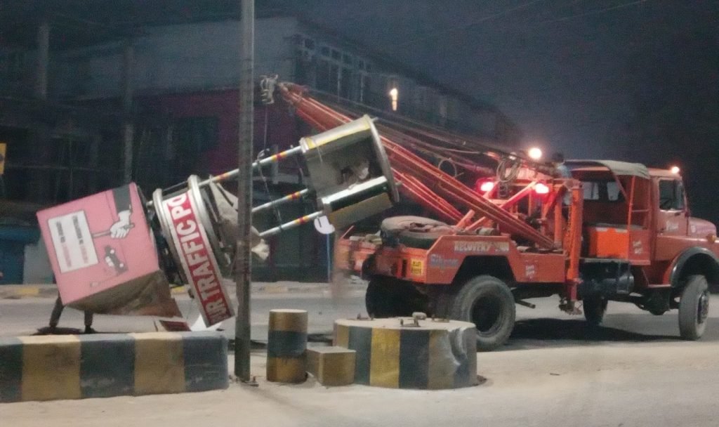 The damaged traffic police point being towed away.
