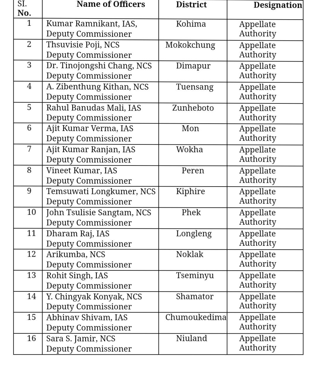 The State Election Commissioner, Nagaland, T. John Longkumer, IPS (Rtd), has notified that in pursuance of sub rule (3) of Rule 9 of the Nagaland Municipal Election Rules 2023 and in exercise of the powers conferred under section 31 (1) of the Nagaland Municipal Act 2023, the Deputy Commissioners in the State have been designated the “Appellate Authorities” under their respective districts on behalf of the State Election Commission for disposing of appeals during the period of the conduct of Special Summary Revision of Electoral Rolls, 2024 in the Municipal and Town Councils.