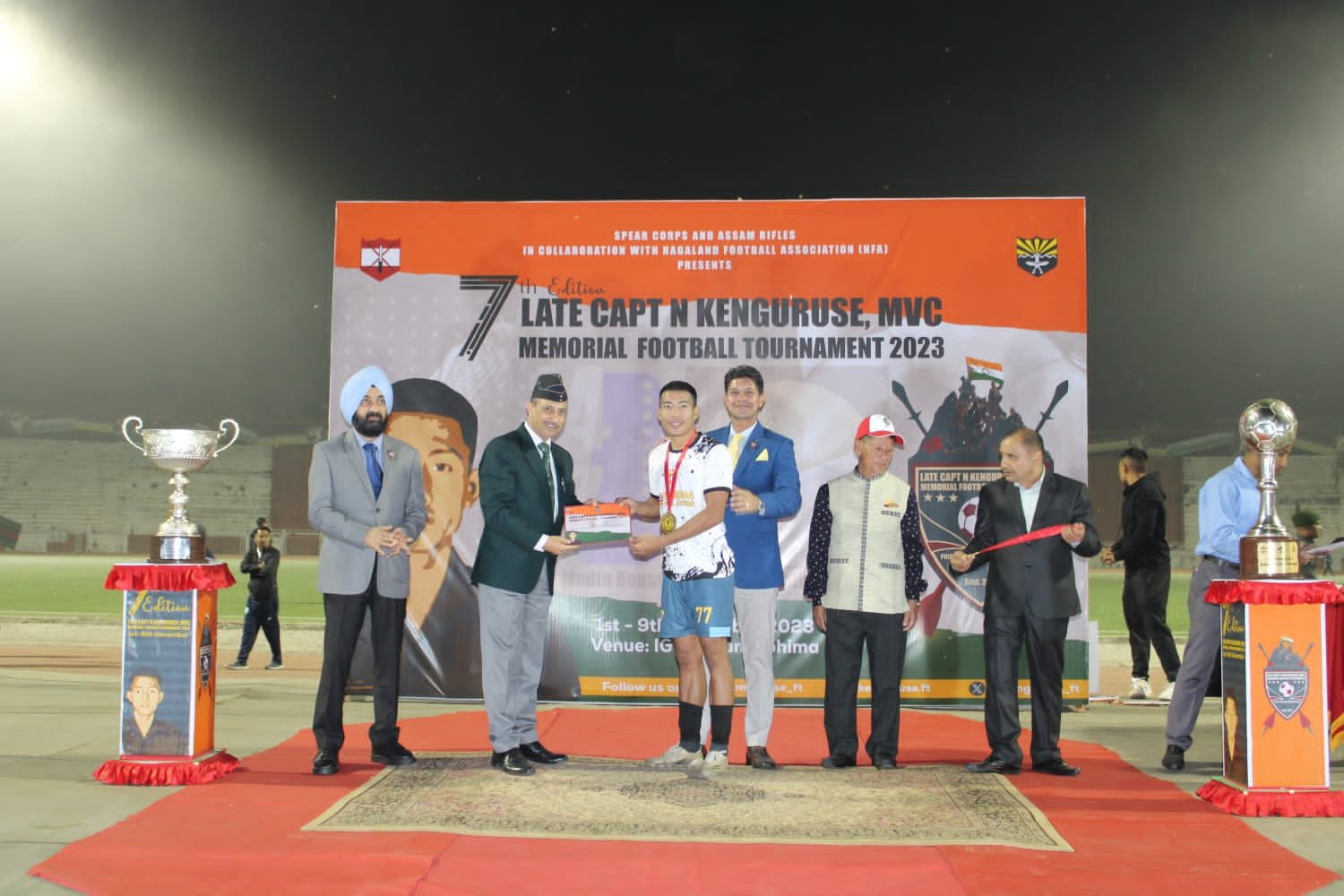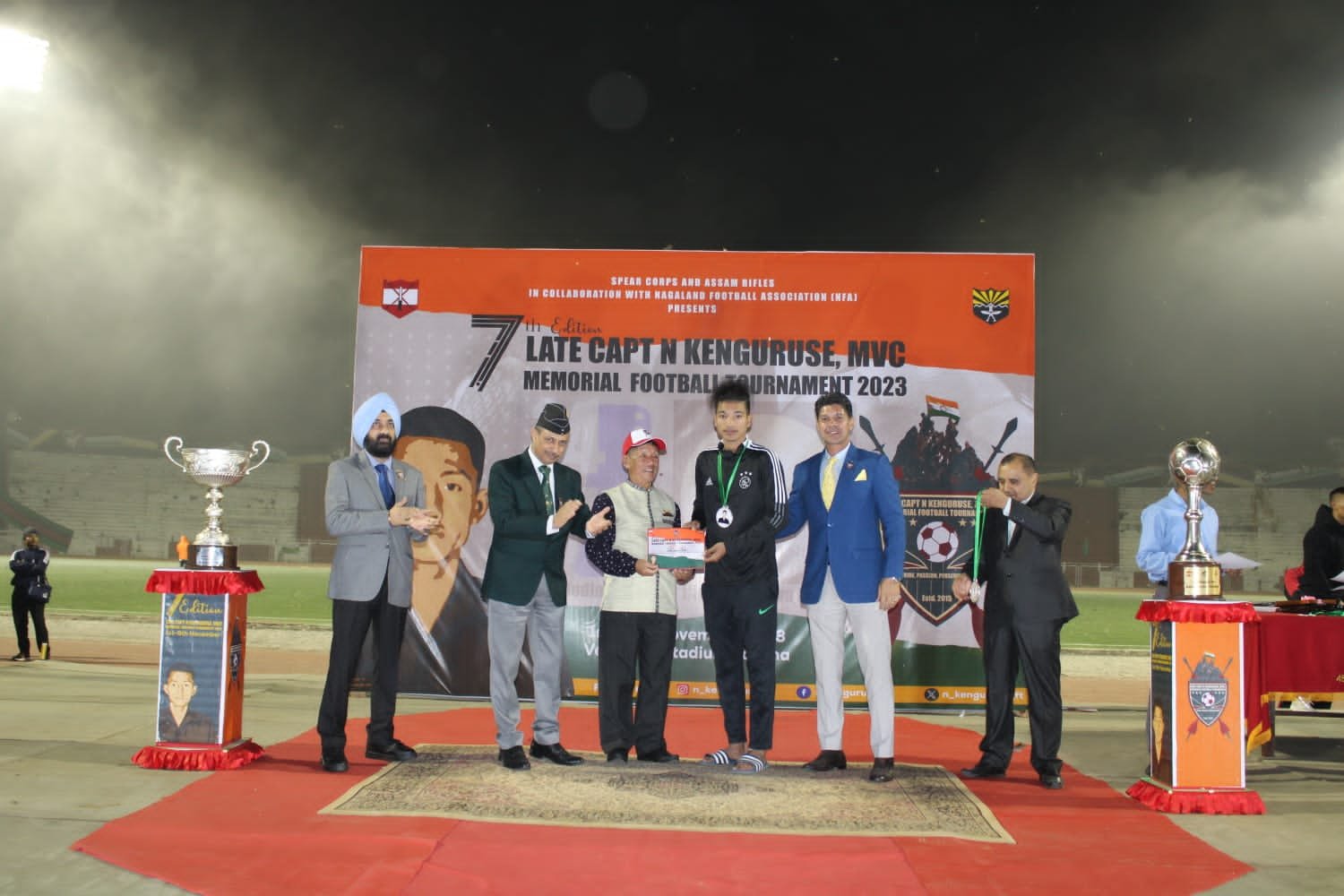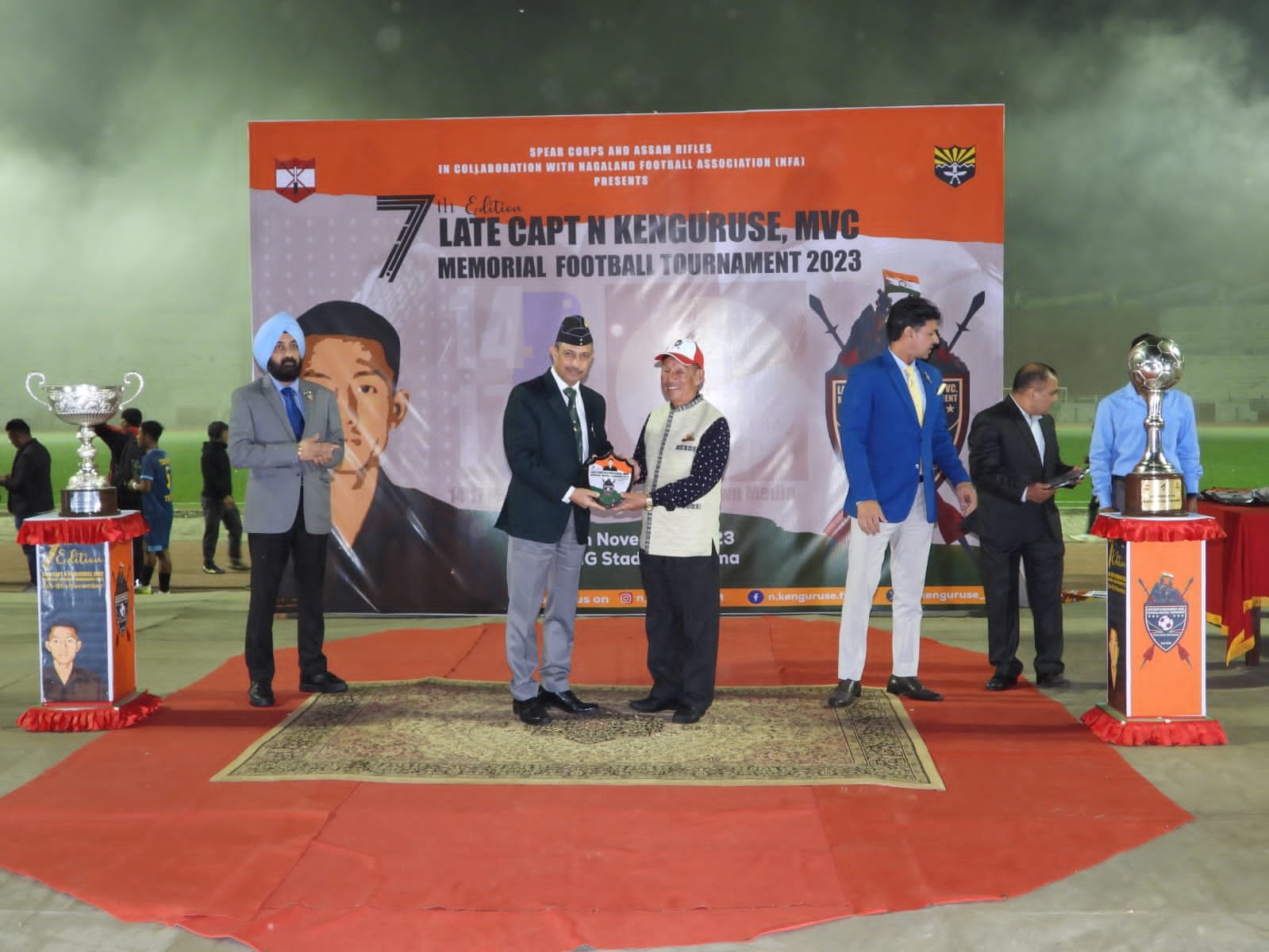 The highly anticipated final match of the Late Capt N Kenguruse, MVC, Memorial Football Tournament 2023 was held on November 9 at IG Stadium organised by Assam Rifles under the aegis of Spear Corps. The thrilling event witnessed two exceptional teams, Tehok FC, Mon & Western Sumi Sports Association, Niuland battling it out for the coveted championship title in front of an electrified audience.