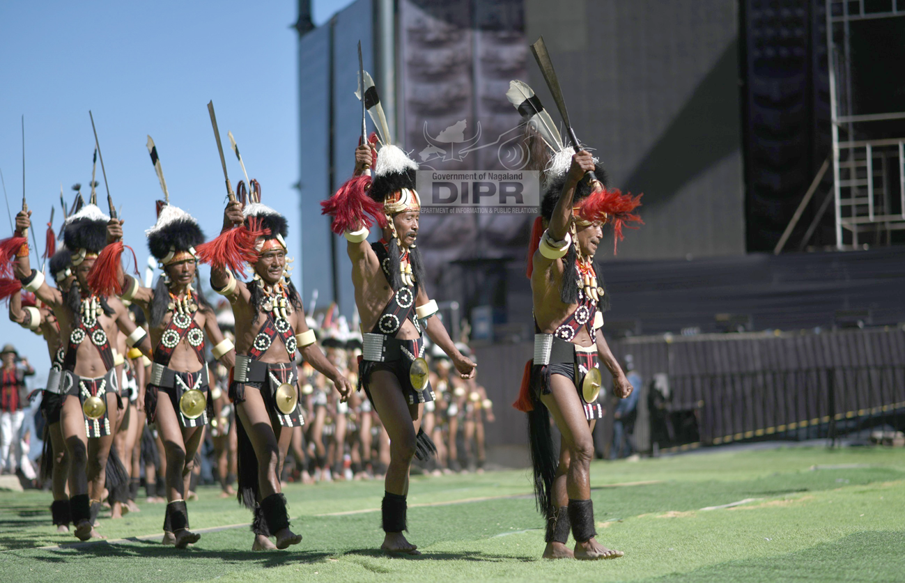 Chang Cultural Troupe showcased Kongkin Dookbü, performed during the Naknyu festival. Houses and pathways are decorated with Ngounam leaves, and traditional bamboo flute (kongkin) music accompanies the festivities. Khiamniungan Cultural Troupe presented a traditional act depicting the customary haircut of Khiamniungan men.